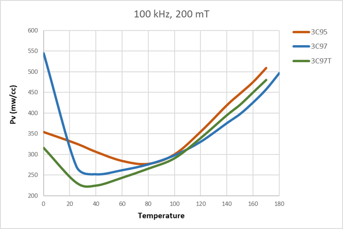Like 3C97, it has a high Bsat, making it a good choice for designs that require both efficiency and saturation margin. Although it does not outperform 3C95 in very cold environments nor 3C97 in extreme heat conditions, it achieves a very solid balance for a wide range of applications.